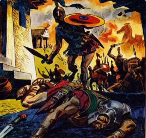 Αινείας Μέσα στην αναπάντεχη καταστροφή, ένα ευγενικό παλικάρι των Τρώων, ο Αινείας, πετάχτηκε απ’ το γλυκό ύπνο, πήρε τα όπλα του και πολεμώντας γενναία, κατόρθωσε να φτάσει ως το παλάτι. Βρήκε όμως τον Πρίαμο νεκρό και κατάλαβε ότι η πατρίδα του δεν είχε σωτηρία. |
