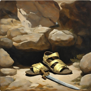 Αιγέας - Αίθρα Στο μικρό διάστημα που έζησαν μαζί στην Τροιζήνα, πήρε μια μέρα ο Αιγέας την Αίθρα και βγήκαν περίπατο στην εξοχή. Έβγαλε το σπαθί του κι έσκαψε ένα λάκκο. Έβαλε μέσα τα σανδάλια και το ξίφος του κι από πάνω κύλησε μια μεγάλη πέτρα. Ύστερα είπε στην Αίθρα: |