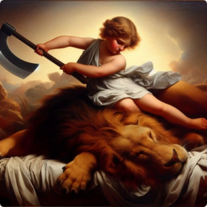 Θησέας και λεοντή Όταν λοιπόν ήρθαν προς την πόρτα, τα άλλα παιδιά έφυγαν τρομαγμένα όταν είδαν τη λεοντή. Ο Θησέας, όμως, άρπαξε ένα τσεκούρι και όρμησε να χτυπήσει, γιατί τη νόμισε πως ήταν ζωντανό λιοντάρι. |