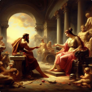 Κάτω από τον βράχο — Αγαπημένη μου γυναίκα, εγώ σε λίγο θα φύγω. Πρέπει να φύγω. Αν γεννήσεις αγόρι, θέλω να το μεγαλώσεις σαν βασιλόπουλο. Κι όταν γίνει άξιο παλικάρι, να το φέρεις εδώ και να του φανερώσεις το μυστικό. Αν μπορέσει και σηκώσει το βράχο, να πάρει τα σανδάλια και το ξίφος μου και να έρθει στην Αθήνα να με βρει. |