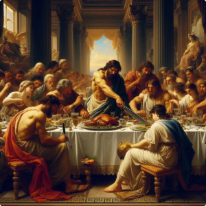 Τιμές στον ήρωα Η φήμη του για τα κατορθώματά του είχε έρθει πριν από αυτόν. Όλοι λοιπόν τον καλοδέχτηκαν και ο ίδιος ο βασιλιάς τον προσκάλεσε να φάνε. Την ώρα που έτρωγαν, θέλησε να κόψει το κρέας και τράβηξε με το χέρι του το ξίφος, αντί για το μαχαίρι. Το βλέπει ο Αιγέας, βλέπει και τα σανδάλια και άρχισε να τον ρωτάει ποιος είναι και από πού έρχεται. |