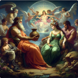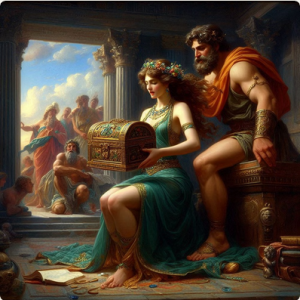 Πανδώρα - Επιμεθέας Ο Δίας έδωσε στην Πανδώρα ένα κουτί (ή πιθάρι) και της είπε να μην το ανοίξει ποτέ. Στη συνέχεια, την έστειλε στη γη για να γίνει η σύζυγος του Επιμεθέα. Παρά το ότι ο Προμηθέας τον είχε προειδοποιήσει να μην δεχτεί κανένα δώρο από τους θεούς, ο Επιμεθέας είδε την όμορφη Πανδώρα και την παντρεύτηκε. |