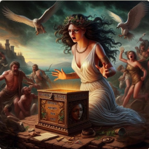 Άνοιγμα κουτιού Μόλις άνοιξε το κουτί, ξεπήδησαν όλα τα κακά του κόσμου: αρρώστιες, φτώχεια, πόνος, φθόνος και άλλες συμφορές. Η Πανδώρα, τρομαγμένη, προσπάθησε να κλείσει το κουτί, αλλά ήταν αργά. Όλα τα κακά είχαν ήδη ξεφύγει και σκορπιστεί παντού. |