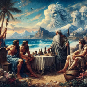 Άραξαν στο ήσυχο λιμάνι κι ο θεός τους καλοδέχτηκε. Τους πρόσφερε όλα τα καλά στα τραπέζια του κι αυτός άκουγε τις ιστορίες που του διηγούνταν ο Οδυσσέας από τον Τρωικό πόλεμο. Έτσι πέρασε ένας μήνας κι όλοι ήταν ευχαριστημένοι |