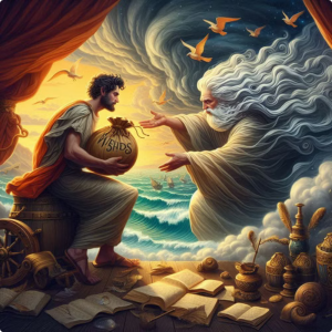 Ο Ποσειδώνας εκδικείται Ξεκίνησαν λοιπόν κι ο ζέφυρος τους ταξίδευε ήσυχα πάνω στη γαληνεμένη θάλασσα. Εννιά μερόνυχτα αρμένιζαν ήσυχα, και τη δέκατη μέρα φάνηκαν από μακριά τα βουνά της Ιθάκης. Τότε, κουρασμένος, ο Οδυσσέας αποκοιμήθηκε ήσυχος, πια, ότι φτάσανε. Μα ο Ποσειδώνας αγρυπνούσε κι έβαλε στο μυαλό των συντρόφων του Οδυσσέα τούτη τη σκέψη: «Τώρα φτάσαμε πια. Ας δούμε λοιπόν τι δώρα έβαλε ο Αίολος μέσα στο ασκί». |