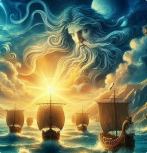 Ήρεμο ταξίδι Με φουσκωμένα τα πανιά από το γλυκό αεράκι, πηδούσαν πάνω από τα μικρά κύματα τα καράβια του Οδυσσέα, κι έσκιζαν τη θάλασσα σαν τα δελφίνια. Αρμένιζαν μεσοπέλαγα, χαρούμενοι που γλύτωσαν και γύριζαν στην πατρίδα. Στο δρόμο τους λοιπόν βρέθηκε ένα νησί, που ζούσε ο Αίολος, ο θεός των ανέμων. |