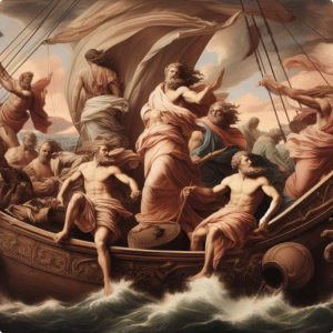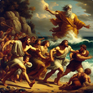 Σαν τους είδε πίσω ο θεός, θυμωμένος που τον παράκουσαν, τους έδιωξε. Ανοίχτηκαν πάλι οι δυστυχισμένοι στη φουρτουνιασμένη θάλασσα, παλεύοντας με τα κύματα να γλυτώσουν. |