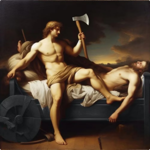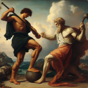 Ο ΛΗΣΤΗΣ ΠΕΡΙΦΗΤΗΣ Περπατώντας ο Θησέας πλησίαζε την Επίδαυρο. Εκεί κοντά ήταν ένας πελώριος ληστής που είχε ένα μεγάλο ρόπαλο, ο Περιφήτης. Καθόταν κοντά στο δρόμο και όταν έβλεπε κανένα διαβάτη, τον σκότωνε χτυπώντας τον με το ρόπαλο και τον λήστευε. Όταν είδε λοιπόν και τον Θησέα, σηκώθηκε έτοιμος να τον χτυπήσει. Ο Θησέας όμως δεν περίμενε, αλλά όρμησε πάνω του και αρπάχτηκαν στα χέρια. Πάλεψαν πολλή ώρα, ώσπου τον πήρε το ρόπαλο. Και τότε τον σκότωσε, όπως σκότωνε και ο ίδιος τους άλλους. Το ρόπαλο από τότε το κρατούσε πάντα μαζί του.