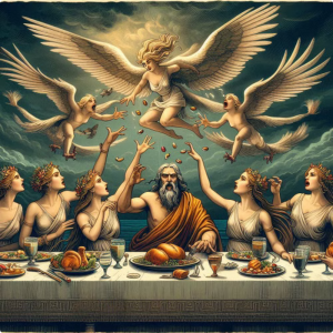 Οι Άρπυιες Στη συνέχεια, ο Δίας έστειλε στα μέρη του Φινέα τις Άρπυιες, πέντε μυθολογικά όντα με σώμα πουλιού και κεφάλι γυναίκας. Αυτές άρπαζαν το φαγητό του Φινέα κάθε φορά που ετοιμαζόταν να φάει. |