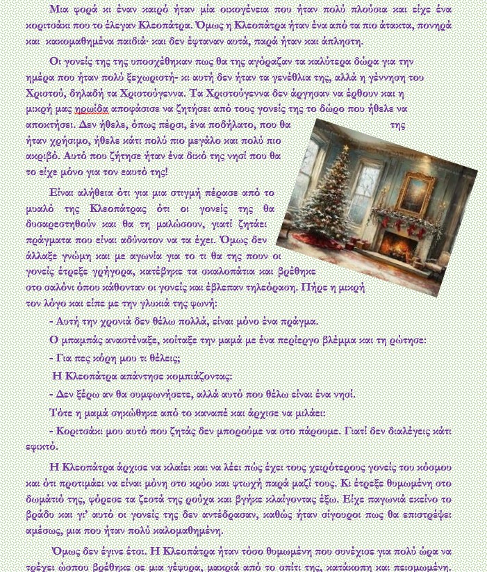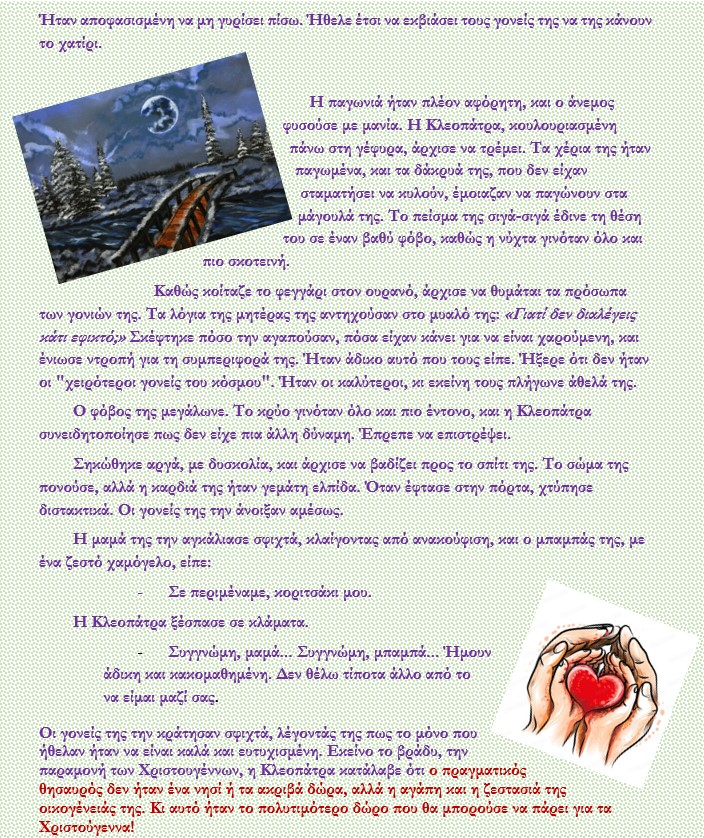 Είδε πως ολόγυρα ήταν άγγελοι με ασημένια φτερά και πως στα χέρια τους κρατούσαν άρπες κι άκουσε που έψελναν ότι τη νύχτα εκείνη γεννήθηκε ο Σωτήρας του κόσμου.