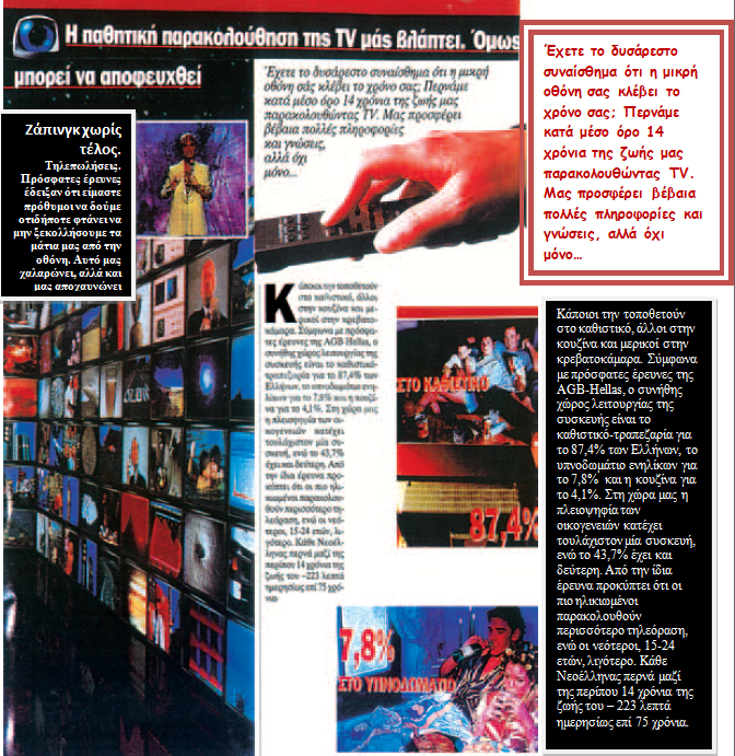 7. Διαβάστε το πλαίσιο πάνω αριστερά (με τίτλο "Ζάπινγκ χωρίς τέλος"). Σε ποιο ερευνητικό πόρισμα γίνεται αναφορά; Πώς μπορούμε με βάση αυτό να ερμηνεύσουμε την προβολή ολονύχτιων εκπομπών με τηλεπωλήσεις;