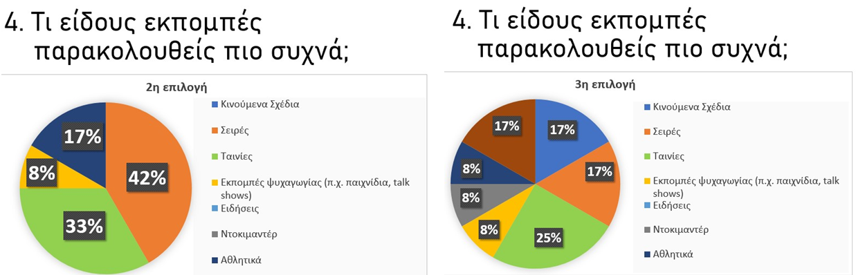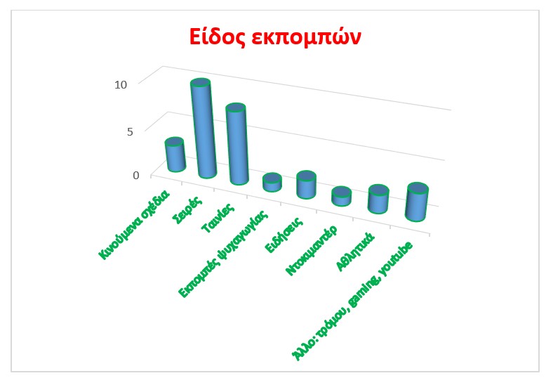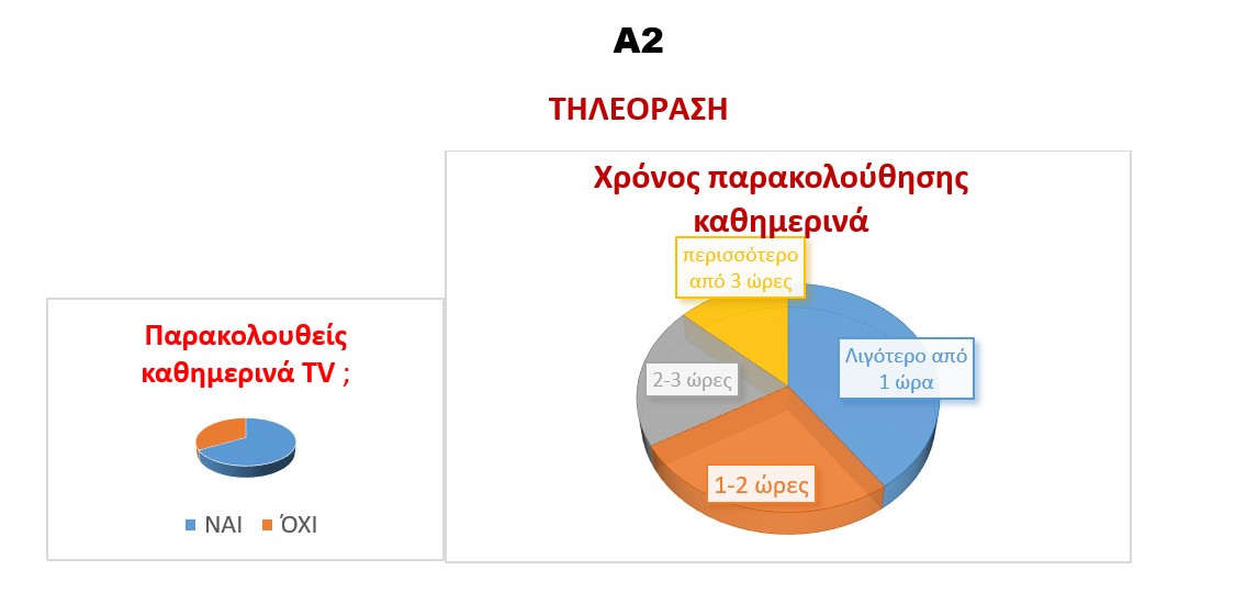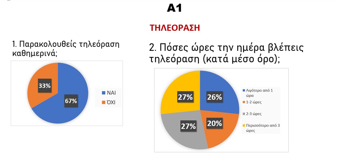 -- Ας σκεφτεί καθένας/καθεμιά σας ποιες εκπομπές βλέπει καθημερινά στην τηλεόραση και πόσο κρατάει καθεμιά. Στη συνέχεια υπολογίστε πόσες ώρες την ημέρα βλέπετε τηλεόραση και συνολικά πόσες ώρες την εβδομάδα. Τι διαπιστώσατε; Παρακολουθείτε τηλεόραση περισσότερο ή λιγότερο από το μέσο όρο;