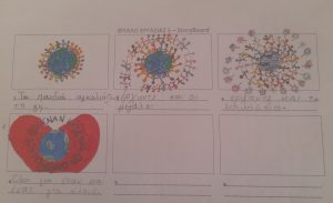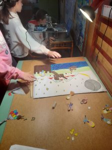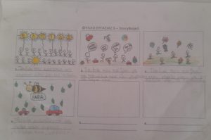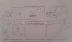 Οι ομάδες συμπλήρωσαμε τη σκαλέτα. Με βάση τους στίχους κάθε τραγουδιού, ζωγραφίσαμε με απλά σκίτσα τις σκηνές της ιστορίας μας.  Κάτω από το κουτάκι γράψαμε έναν μικρό διάλογο που μπορεί να συνοδεύει την σκηνή είτε ακουστικά είτε σε καρτέλα (δεν είναι υποχρεωτικό). Μετά οι ομάδες δημιουργήσαμε τις φιγούρες και τα σκηνικά αναλόγως με το είδος του stop motion που επιλέξαμε.