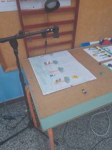 α. Στερεώσαμε χαρτί του μέτρου, πάνω στο οποίο ζωγραφίσαμε το σκηνικό της ταινίας μας, σε δύο θρανία ενωμένα και την συσκευή λήψης (τάμπλετ) με τρίποδο, στο κατάλληλο ύψος, ώστε να καλύπτει το σκηνικό μας.