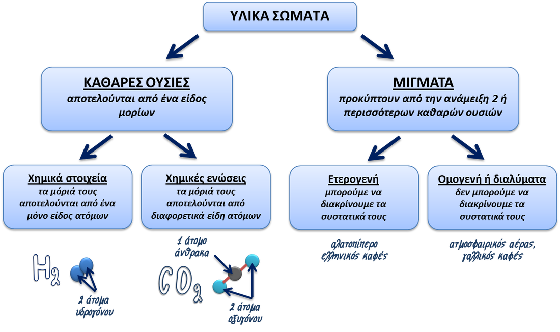 Επίσης, θυμηθήκαμε σε ποιες κατηγορίες χωρίζονται τα υλικά σώματα με βάση τα συστατικά τους: