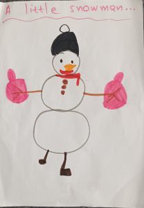 Some of the first things we said about winter is that it is very very cold and sometimes it is snowy. Then I drew a simple snowman but he was very sad because he didn't have any clothes on... What do we wear when we're cold? So, then it was the students' turn to draw: a hat, a scarf, gloves and boots.