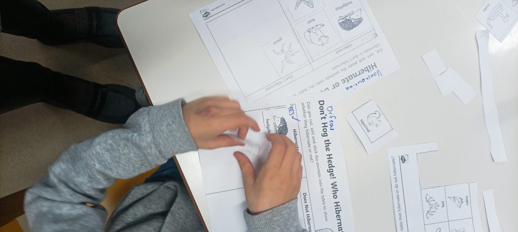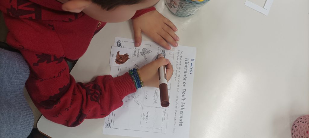 Finally, we decided through a "cut and glue" worksheet whether certain animals sleep through the winter or not and coloured them!