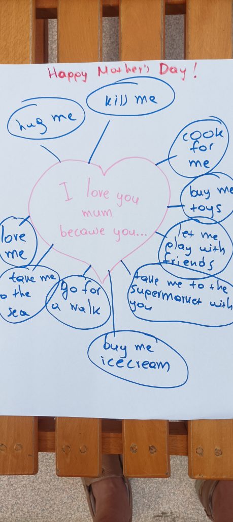 So, the first thing we did was to discuss how valuable mothers are in our life. Some of their ideas included: hugs, kisses, telling them that you love them, taking care of them, cooking for them and a lot more touching thoughts...