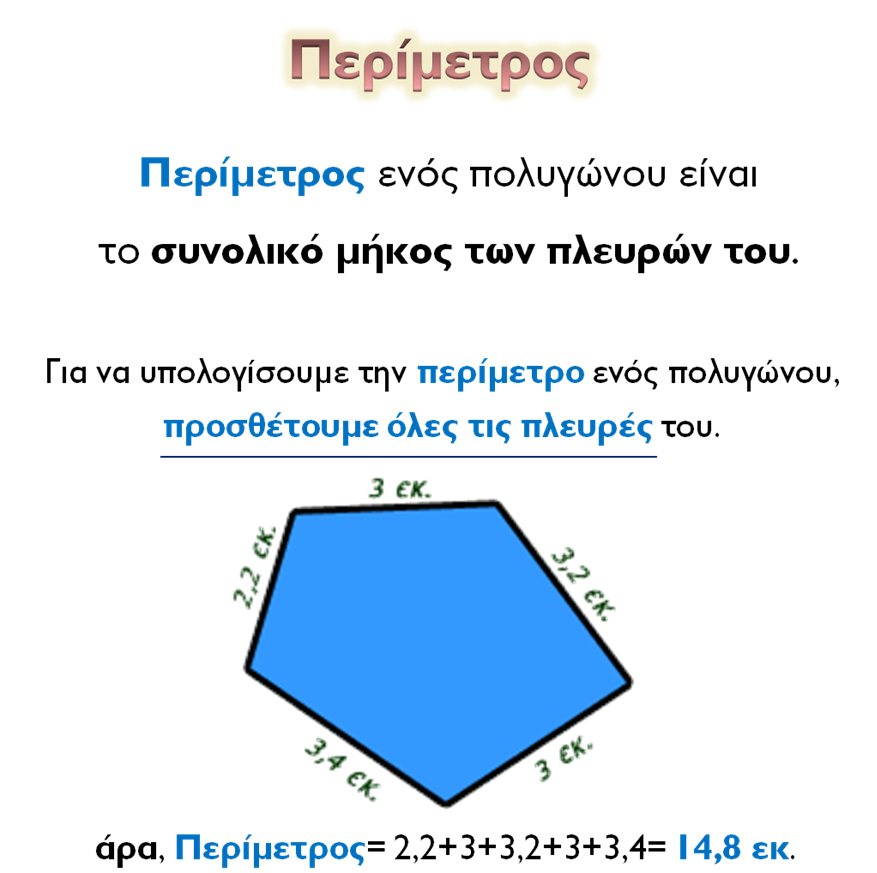 Σήμερα συνεχίσαμε να κάνουμε εξάσκηση στα πολύγωνα και μελετήσαμε πώς βρίσκουμε την Περίμετρο.