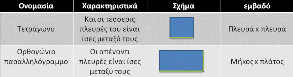 Στο σημερινό μάθημα είδαμε πώς μπορούμε να βρούμε γρήγορα και εύκολα το εμβαδόν ενός τετραγώνου και ενός ορθογώνιου παραλληλόγραμμου.