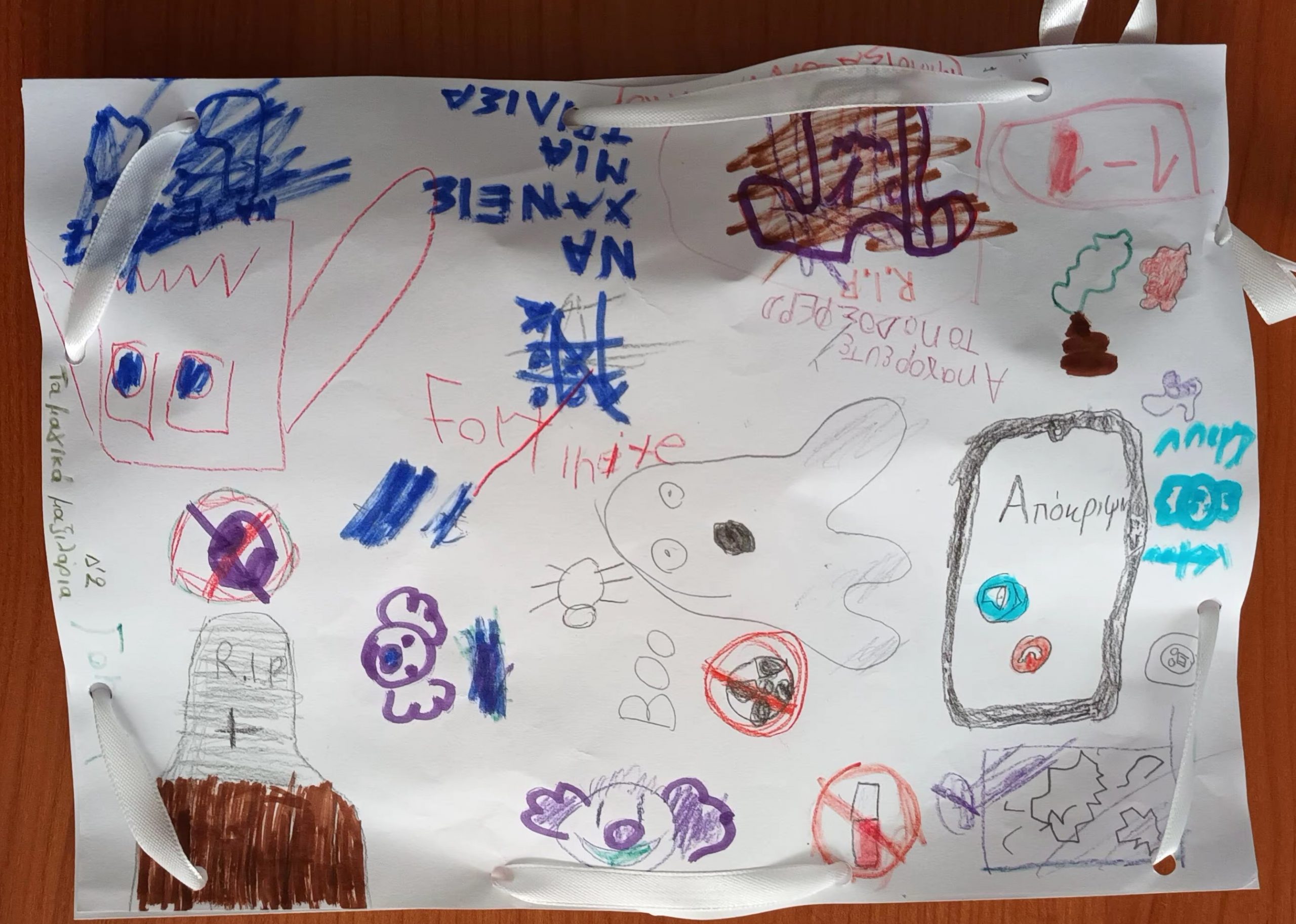 - Οι μαθητές ζωγραφίζουν δύο χαρτιά Α4. Στο ένα κάτι εφιαλτικό και στο άλλο κάτι αντιεφιαλτικό. Τα ενώνουμε, τα γεμίζουμε με άλλα χαρτιά και φτιάχνουμε ένα μαξιλάρι με δύο πλευρές μία εφιαλτική και μία μη εφιαλτική.