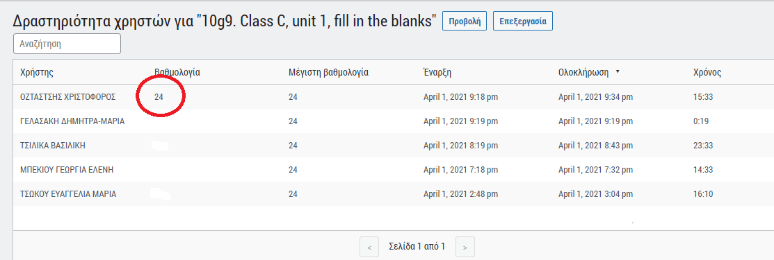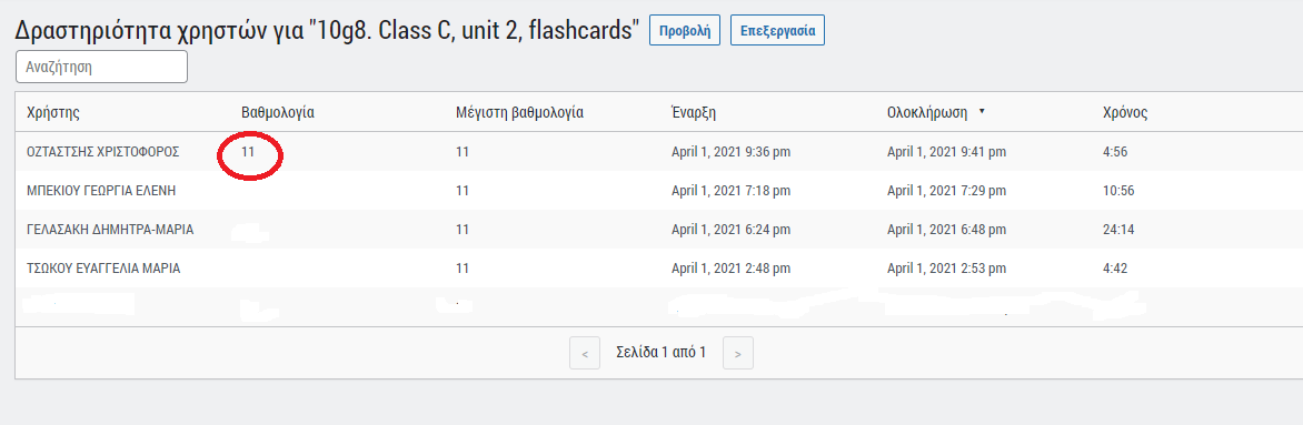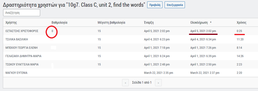 Προφανώς η πλατφόρμα (που δεν είναι δημιουργημά μου αλλά το Υπουργείο Παιδείας προτείνει!) δεν κατανοεί (ούτε κι εγώ) την επιθετικότητά σας αγαπητέ κύριε. Εγώ είμαι υποχρεωμένη να πληροφορώ τους γονείς, όταν τα παιδιά τους δεν έχουν κάνει τις ασκήσεις. Και η κακιά πλατφόρμα ‘e-me’ δείχνει πως ο Χριστόφορος μπήκε στην άσκηση μόνο μια φορά, στις 2 το απόγευμα της 5ης Απριλίου και μόνο για 25 δευτερόλεπτα, και μάλιστα 2 μέρες αφού αφήσατε το ομολογουμένως χωρίς λόγο επιθετικό μήνυμά σας. Άλλωστε ΔΕΝ ΕΙΝΑΙ η πρώτη φορά που ο Χριστόδουλος δεν κάνει τις ασκήσεις αν δεν του το υπενθυμίσω αρκετές φορές, αντίθετα είναι συχνό φαινόμενο τον τελευταίο καιρό. Το περίεργο είναι πως μόνο εκείνος έχει προβλήματα με την πλατφόρμα που δεν συγκρατεί τις προσπάθειές του. Αυτό δεν σας βάζει σε σκέψεις πως ή δεν κάνει τις ασκήσεις ή προσπαθεί να τις αποφύγει;