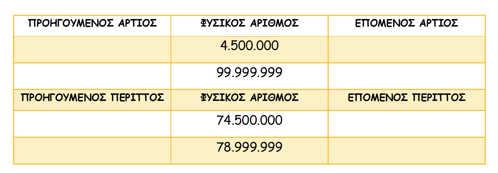 4.500.000 --> ο προηγούμενός του είναι 4.499.999, ο οποίος είναι περιττός, επειδή τελειώνει σε 9. Όμως, εμείς θέλουμε τον προηγούμενο άρτιο, οπότε πηγαίνουμε στον αμέσως προηγούμενο: 4.499.998, ο οποίος τελειώνει σε 8, οπότε είναι άρτιος. Το ίδιο με τον επόμενο άρτιο, ο οποίος είναι ο: 4.500.002.