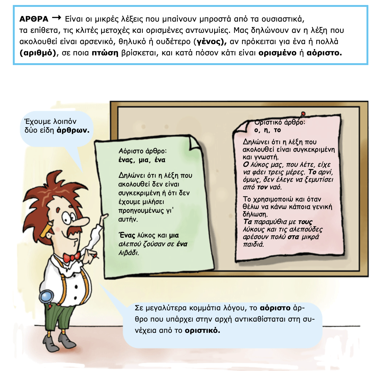 - Παιχνίδι εξάσκησης στη χρήση των οριστικών και αόριστων άρθρων: https://wordwall.net/resource/82809321