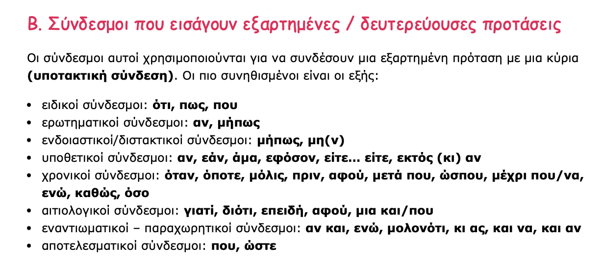 Ξεκινούν με αιτιολογικούς και χρονικούς συνδέσμους. Χρησιμοποιούμε τις αιτιολογικές για να δηλώσουμε την αιτία, να αιτιολογήσουμε να δικαιολογήσουμε μία πράξη ή δράση. Χρησιμοποιούμε τις χρονικές για να δηλώσουμε τον χρόνο κατά τον οποίο γίνεται μια πράξη ή δράση. Οι χρονικοί και οι αιτιολογικοί σύνδεσμοι φαίνονται παρακάτω: