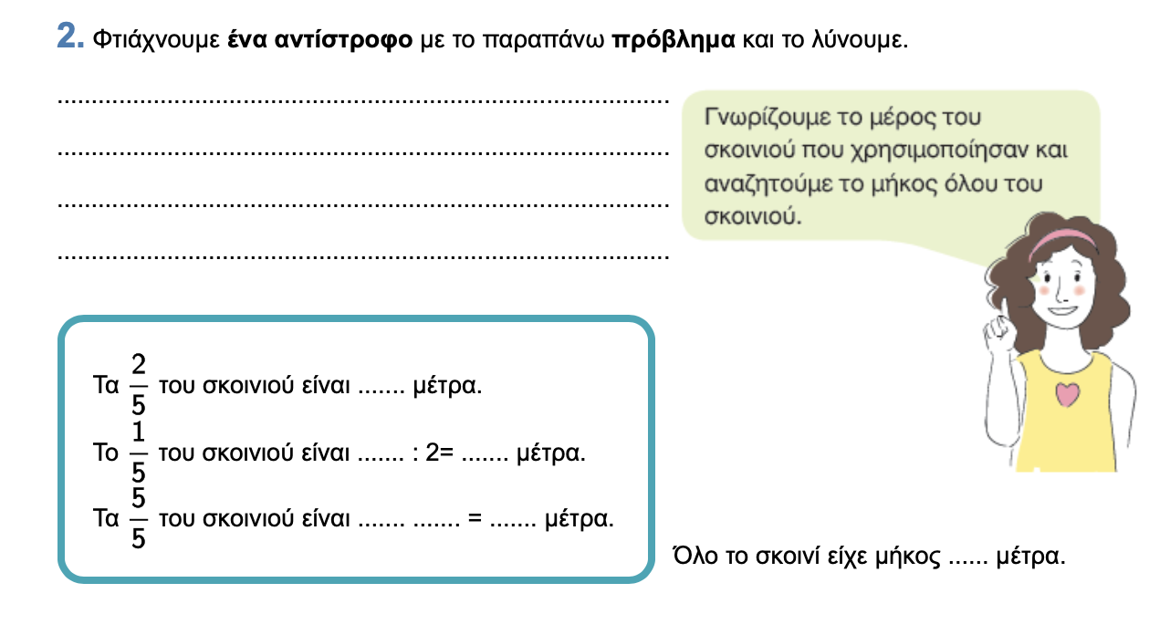 Στην άσκηση πρέπει να γράψουμε ένα πρόβλημα στο οποίο θα ξέρουμε πόσα μέτρα είναι τα 2/5 του σκοινιού και θα ψάχνουμε πόσα μέτρα είναι όλο το σκοινί.