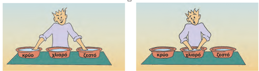Πρόκειται για το γνωστό πείραμα. Πρέπει να μπορούμε να το περιγράφουμε και να πούμε τι παρατηρούμε όταν βάλουμε τα χέρια μας στο χλιαρό νερό. Επίσης, το συμπέρασμα που προκύπτει: