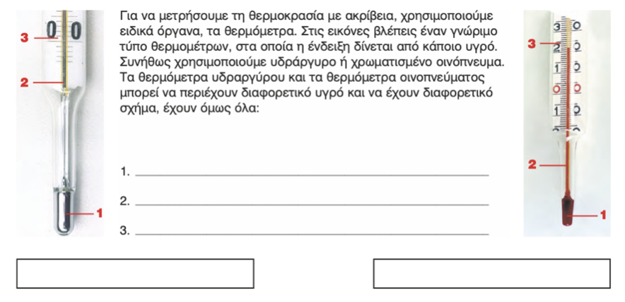 Φυσικά στην πρώτη εικόνα έχουμε θερμόμετρο υδραργύρου και στη δεύτερη θερμόμετρο οινοπνεύματος. Τα μέρη του θερμομέτρου είναι ίδια: