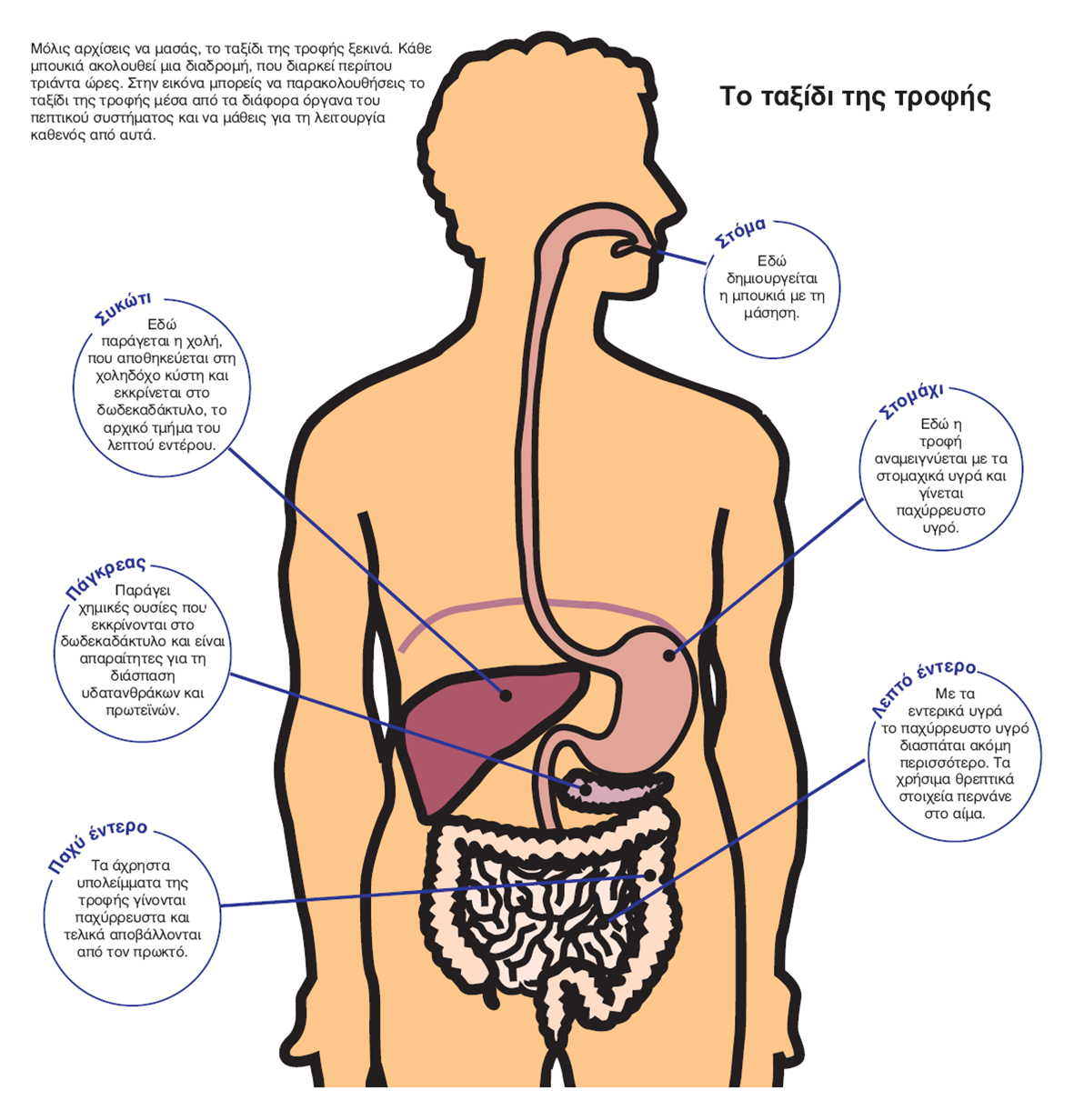 Παρατηρούμε τα μέρη του πεπτικού συστήματος και διαβάζουμε -για να θυμηθούμε- τη λειτουργία τους.