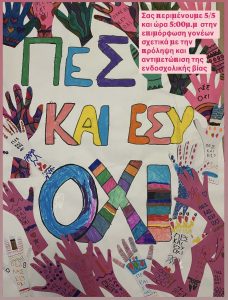 «Πες και εσύ όχι » είναι ο τίτλος του σχεδίου δράσης του σχολείου μας για το σχολικό έτος 2024-2025 . Με αφορμή τα αυξανόμενα περιστατικά βίας και σχολικού εκφοβισμού αποφασίσαμε να αναπτύξουμε ένα σχέδιο δράσης ώστε να ευαισθητοποιήσουμε παιδιά και γονείς  σχετικά με το θέμα και να βοηθήσουμε τα παιδιά μας να αναπτύξουν  ήπιες δεξιότητες σχετικά με την αντιμετώπιση τέτοιας φύσεως ζητημάτων .
