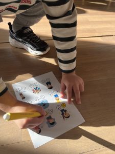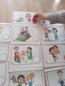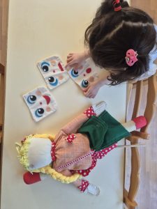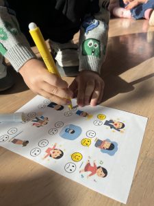 Μέσα από το θεατρικό παιχνίδι και με την βοήθεια της κούκλας των συναισθημάτων μιμούμαστε τον θυμό , την λύπη, την έκπληξη , την χαρά , τον φόβο . Στο πλαίσιο της διερεύνησης του επιπέδου ενσυναίσθησης των παιδιών δείχνουμε στα παιδιά εικόνες και εκείνα διαλέγουν το συναίσθημα που ταιριάζει.