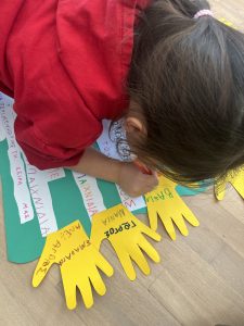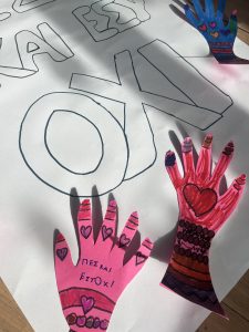 Σε συνέχεια του προγράμματος μας , ετοιμάζουμε το αποτύπωμα από το χεράκι μας και το στολίζουμε με χρώματα και γράμματα για να διακοσμήσει την αφίσα μας. Την στολίσαμε στο χώρο του σχολείου.