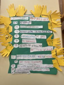 Τα παιδιά μας συζητούν και συμφωνούν για τους κανόνες των τάξεων . Γράφουν το κοινό συμβόλαιο τάξεων προνηπιου και νηπιαγωγείου και «υπογράφουν » γράφοντας το όνομα τους .