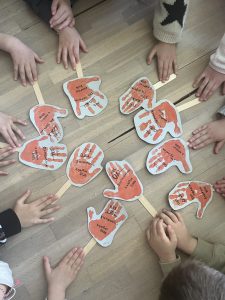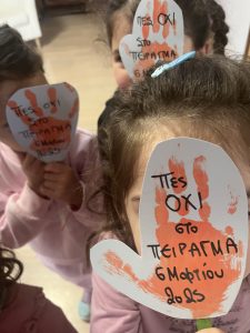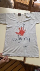 Τα παιδιά μας γιορτάζουν την ημέρα κατά της σχολικής βίας Φτιάχνοντας χειροτεχνίες με μπογιές από το αποτύπωμα του χεριού τους και αναμνηστικά μπλουζάκια φωνάζοντας stop bullying.