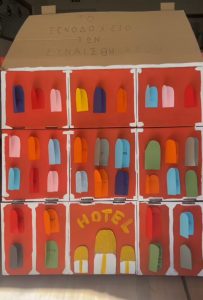 Τα παιδιά μας δραματοποίησαν σενάρια από το βιβλίο «Πες όχι στο πείραγμα»,ανέλαβαν ρόλους, ξεχώρισαν σωστό και λάθος, αποδεκτό και μη αποδεκτό, και ακολουθούν βήματα-λύσεις με βιωματικό, βγαλμένο μέσα από τον κόσμο τους τρόπο. Κατασκευάσαμε το Ξενοδοχείο των συναισθημάτων.