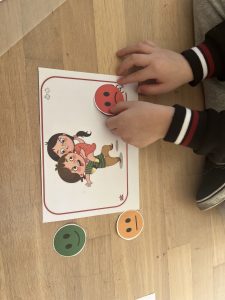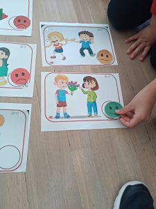 Στη συνέχεια , εκθέσαμε με την βοήθεια εικόνων τα παιδιά μας σε πιθανά σενάρια . Ζητήσαμε από τα παιδιά να περιγράψουν τι βλέπουν στην εικόνα και να εκφράσουν τι νιώθουν για αυτό. Έπειτα τα παιδιά έβαλαν την αντίστοιχη φατσούλα . Κόκκινη για ότι μου προκαλεί  λύπη και δεν είναι αποδεκτό  , πράσινη για ότι μου προκαλεί χαρά και είναι θεμιτό και πορτοκαλί για ότι δεν με νοιάζει και δεν έχει τόση σημασία . Καταγράψαμε τις απόψεις τους και τις συζητήσαμε μαζί τους.