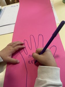 Σε συνέχεια του προγράμματος μας , ετοιμάζουμε το αποτύπωμα από το χεράκι μας και το στολίζουμε με χρώματα και γράμματα για να διακοσμήσει την αφίσα μας. Την στολίσαμε στο χώρο του σχολείου.