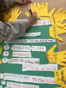 Τα παιδιά μας συζητούν και συμφωνούν για τους κανόνες των τάξεων . Γράφουν το κοινό συμβόλαιο τάξεων προνηπιου και νηπιαγωγείου και «υπογράφουν » γράφοντας το όνομα τους .