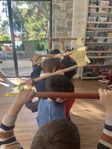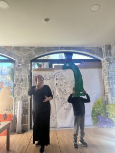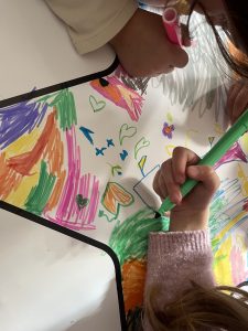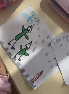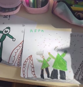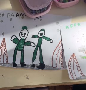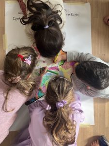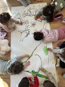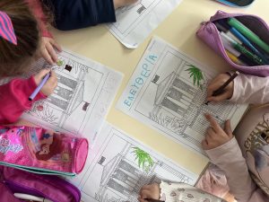 Με το τέλος της ζωγραφηγησης , τα παιδιά  χρωμάτισαν την ιστορία και στόλισαν την «παράσταση» στο χώρο του σχολείου .