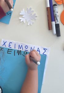 Στη συνέχεια , φτιάξαμε χειμωνιάτικες κατασκευές για να στολίσουμε την τάξη και αντιγράψαμε λέξεις του χειμώνα.