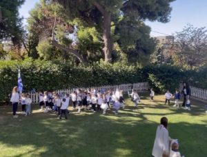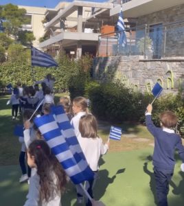 Τα παιδιά μας είπαν ποιήματα ντυμένα στα χρώματα της ελληνικής σημαίας και κάνανε παρέλαση στο κήπο του σχολείου μας .