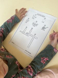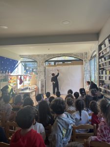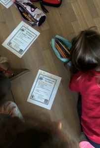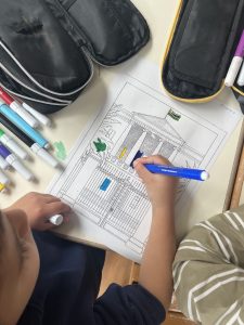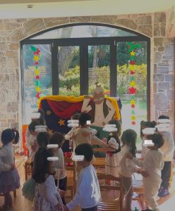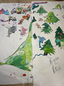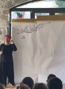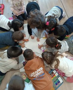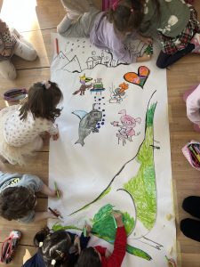 Με το τέλος της ζωγραφηγησης , τα παιδιά  χρωμάτισαν την ιστορία και στόλισαν την «παράσταση» στο χώρο του σχολείου .