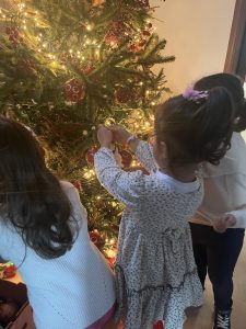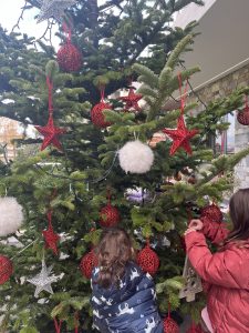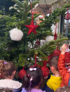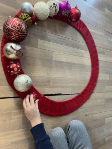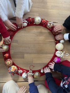 Στο πλαίσιο της ενεργής συνεργασίας μεταξύ των τμημάτων ζητήσαμε από τους γονείς νηπίων και προνηπίων ένα στολίδι ή μπάλα από το δέντρο τους και φτιάξαμε το Στεφάνι των ευχών . Κάθε παιδί κόλλησε το στολίδι του και έκανε μια ευχή για την επόμενη χρόνια . Όταν ολοκληρώθηκε το στολίσαμε στην είσοδο του σχολείου μας .