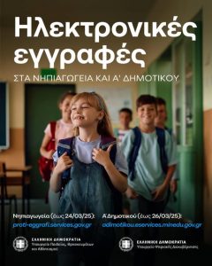 Οι εγγραφές σε Νηπιαγωγεία και Α΄ Δημοτικού για το σχολικό έτος 2025-2026 έχουν ξεκινήσει.