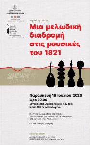 Η Εφορεία Αρχαιοτήτων Αιτωλοακαρνανίας και Λευκάδας, σε συνεργασία με το Μουσείο Ελληνικών Λαϊκών Μουσικών Οργάνων «Φοίβος Ανωγειανάκης» - Κέντρο Εθνομουσικολογίας, έχει τη χαρά να παρουσιάσει στο Ξενοκράτειο Αρχαιολογικό Μουσείο στο Μεσολόγγι την περιοδική έκθεση «Μια μελωδική διαδρομή στις μουσικές του 1821», τα εγκαίνια της οποίας θα πραγματοποιηθούν την Παρασκευή 18 Ιουλίου 2025, ώρα 20.00.