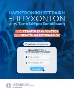 Ξεκίνησαν οι ηλεκτρονικές εγγραφές των επιτυχόντων των Πανελλαδικών Εξετάσεων 2025 καθώς και της ειδικής κατηγορίας πασχόντων από σοβαρές παθήσεις στην Τριτοβάθμια Εκπαίδευση.